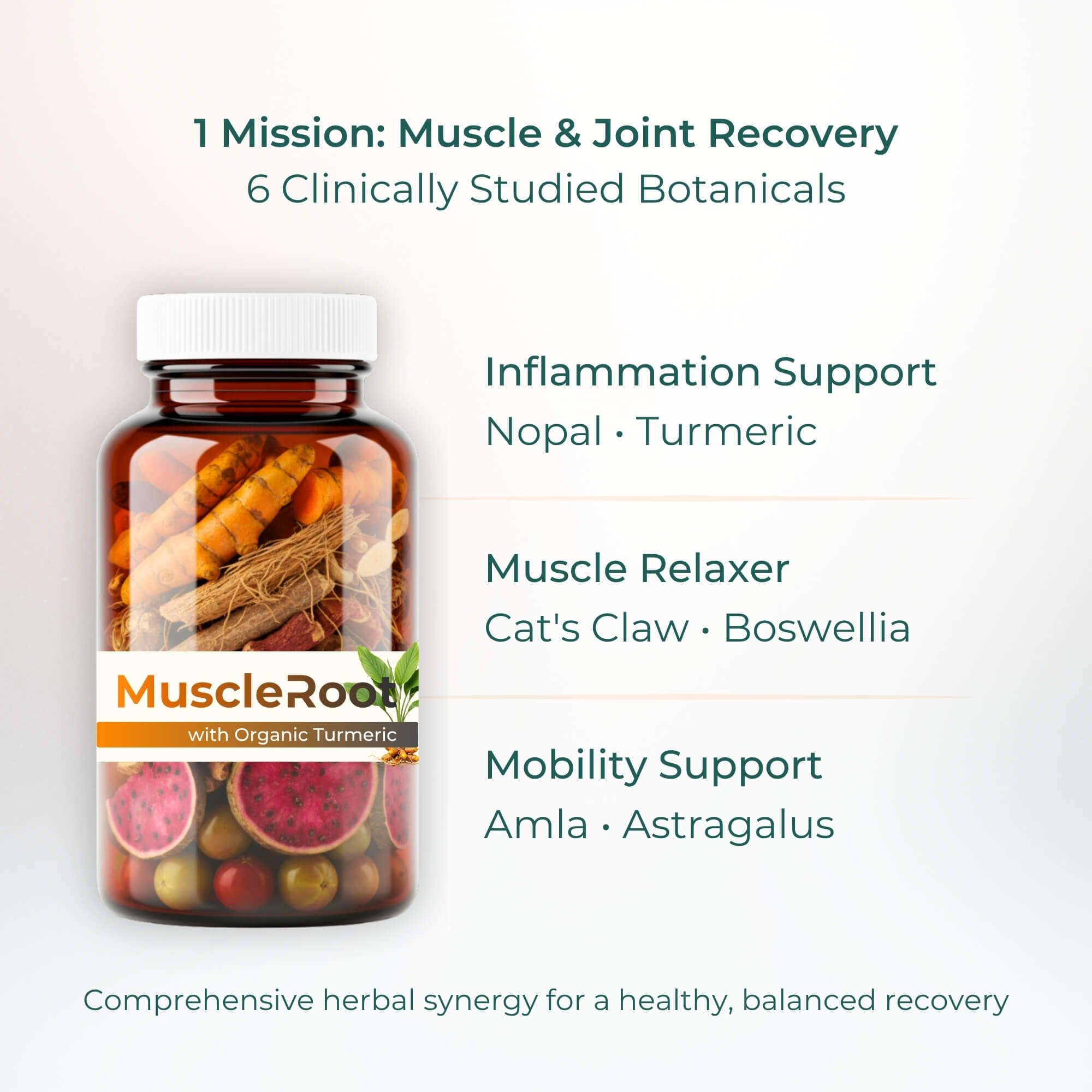 An authentic 6-element functional herbal formulation designed to support healthy inflammatory response in joints and muscles after physical activity — with no adverse effects*.