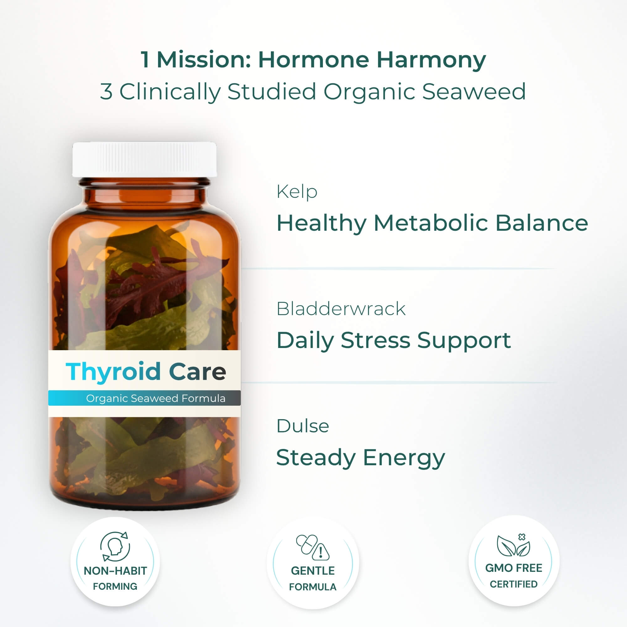 Thyroid Support. Promotes thyroid function and hormonal balance by providing essential iodine, facilitating the synthesis of thyroid hormones and enhancing metabolic processes.